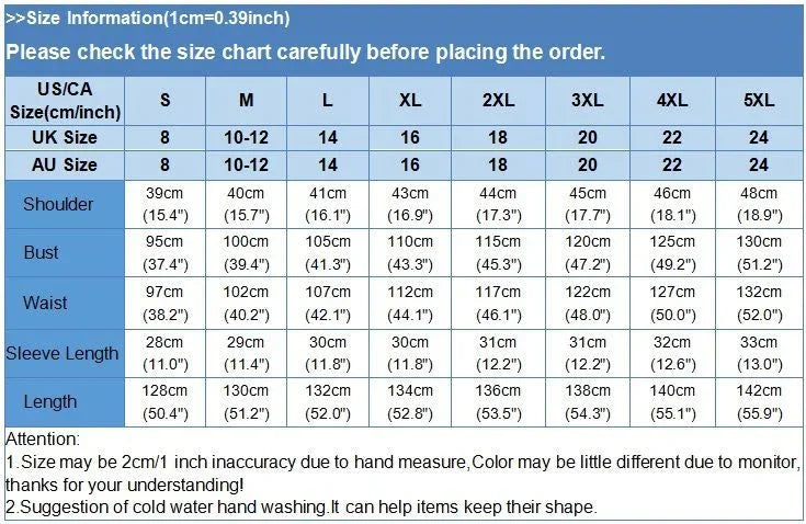 2. Please check the size chart carefully before you buy the item, if you don't know how to choose size, please contact our customer service.