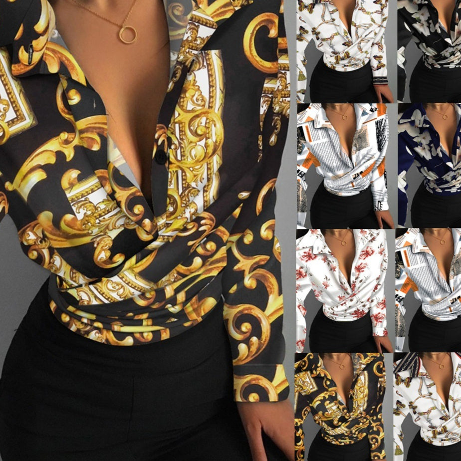 Women's Loose Long-sleeved V-neck Printed Shirt